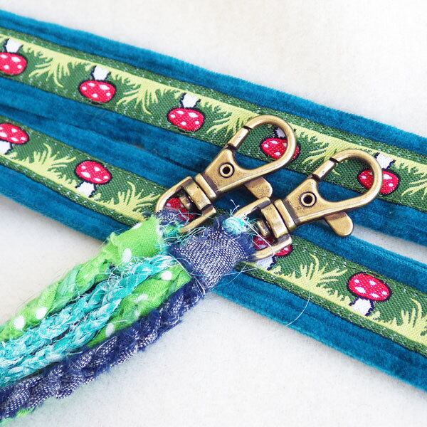 ・ショルダーは、裂き編みと麻ひもを編んだ3本紐に、きのこのチロリアンテープを縫った紐をつなぎ合わせました。