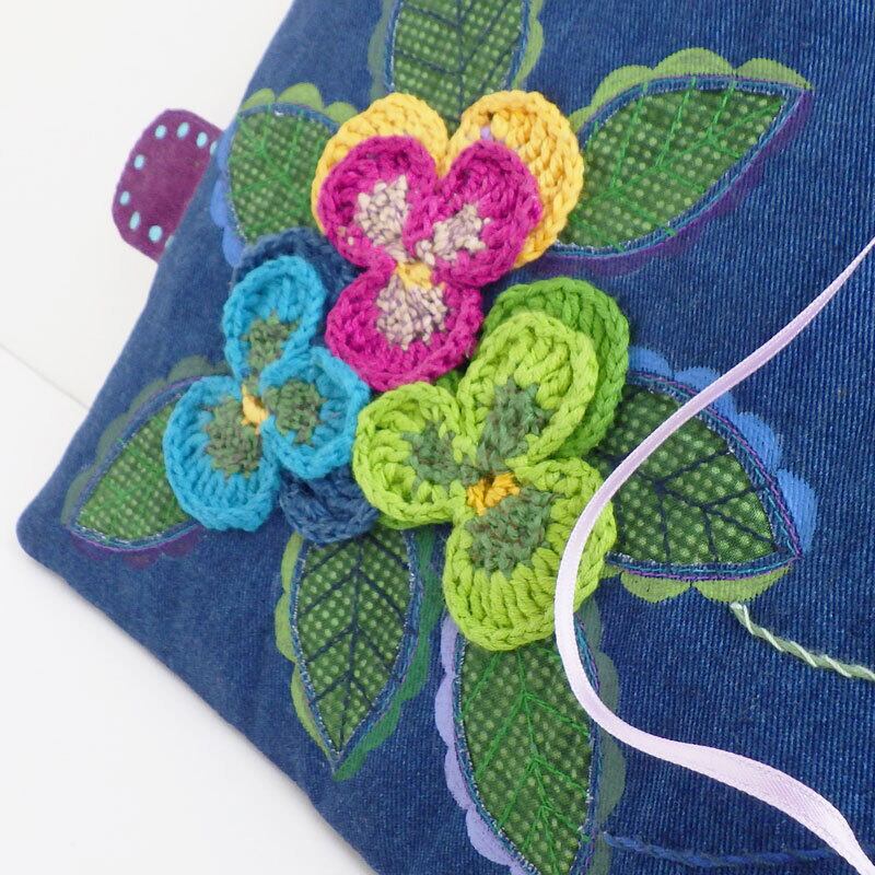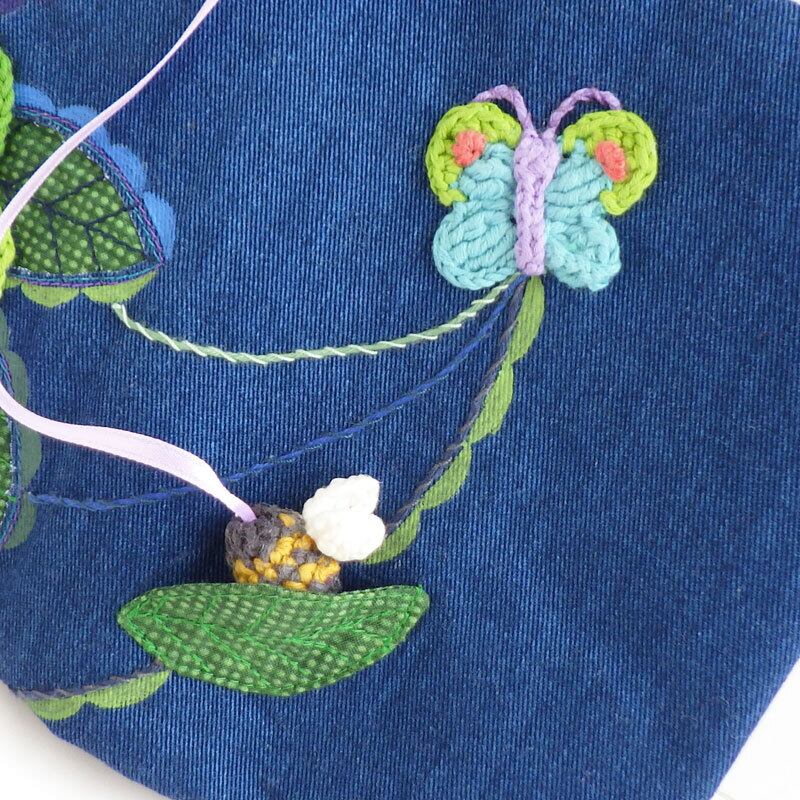 ひとつづつ編んだ、カラフルなモチーフ(パンジー・蝶・ミツバチ)を飾った