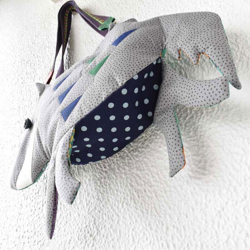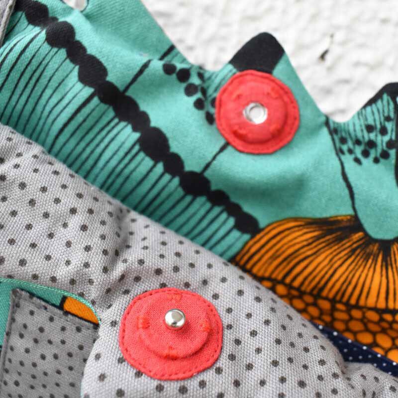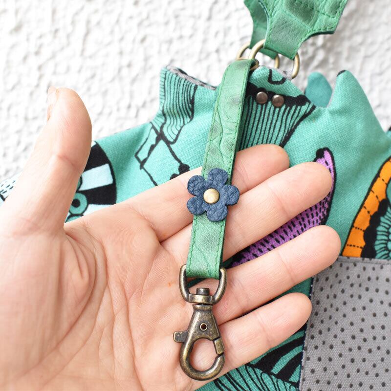 素材:コットン布・ビンテージボタン・ファスナー・チロリアンテープ・革・金属金具ほか